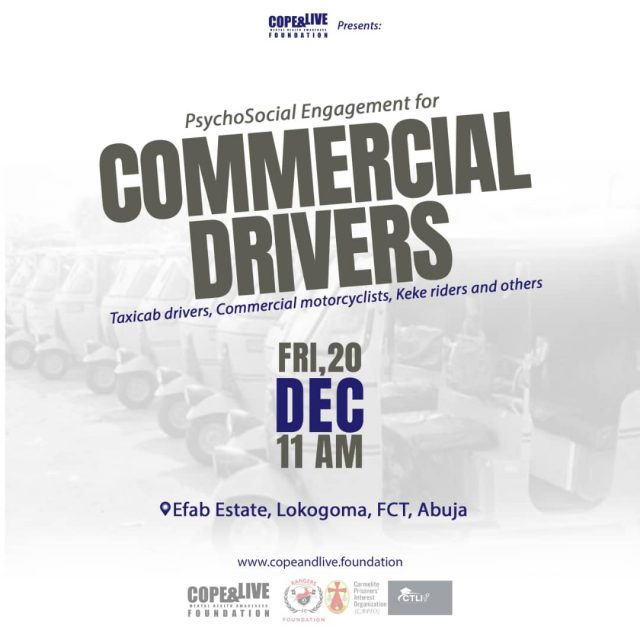 The Cope and Live Mental Health Awareness Foundation, in collaboration with its partners and stakeholders, is committed to conducting complimentary Psychosocial Engagement Exercises for commercial drivers, taxicab drivers, commercial motorcyclists, tricycle riders (Keke drivers), and other relevant individuals prior to the Yuletide season.