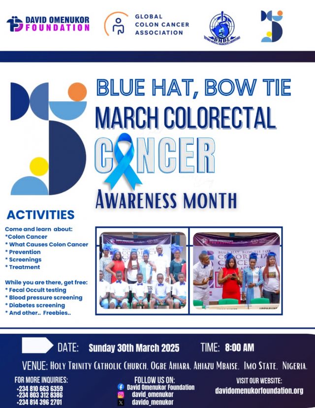 David Omenukor Foundation (DOF), in collaboration with Destinee Medical Diagnostic Laboratories (DMDL), is set to host a Blue Hat Bow Tie for Colorectal Cancer Awareness event in Ogbe, Ahiazu Mbaise, Imo State, on March 30, 2025. This initiative aims to share vital information and raise awareness about colorectal cancer, emphasizing the importance of early detection and prevention.