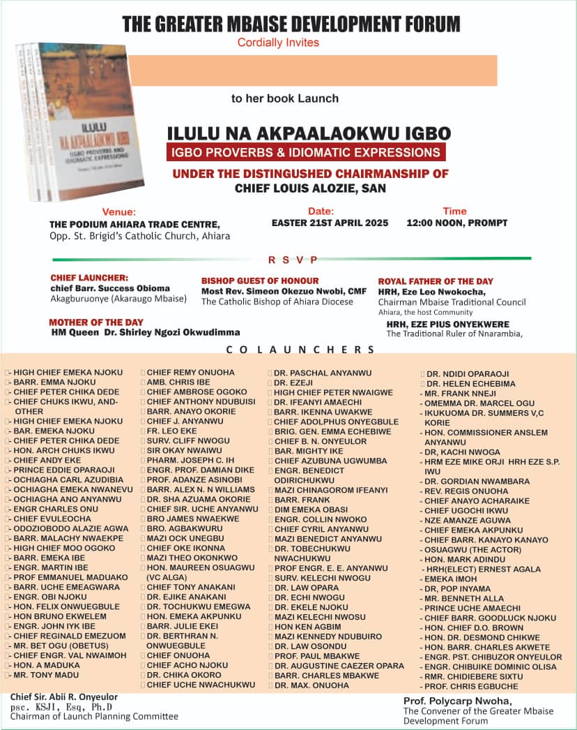 Easter Monday celebrations in Mbaise have taken on a scholarly and cultural tone today, as Chief Louis M. Alozie, Senior Advocate of Nigeria (SAN), chairs the official launch of the groundbreaking Igbo literary work titled “Ilulu Na Akpaalaokwu Igbo.”