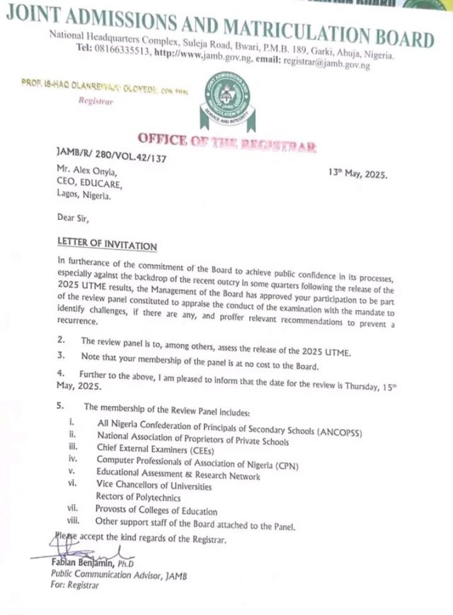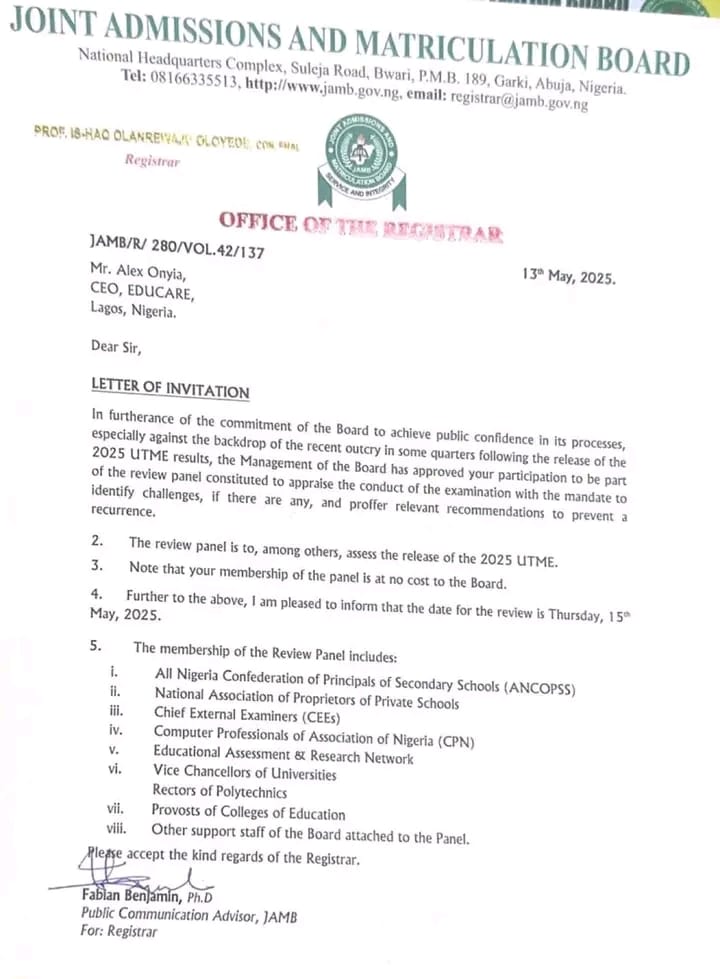 Joint Admission And Matriculation Board, which oversee the entrance examination into Universities has formally invited the Chief Executive of Educare to review this year’s JAMB examination.