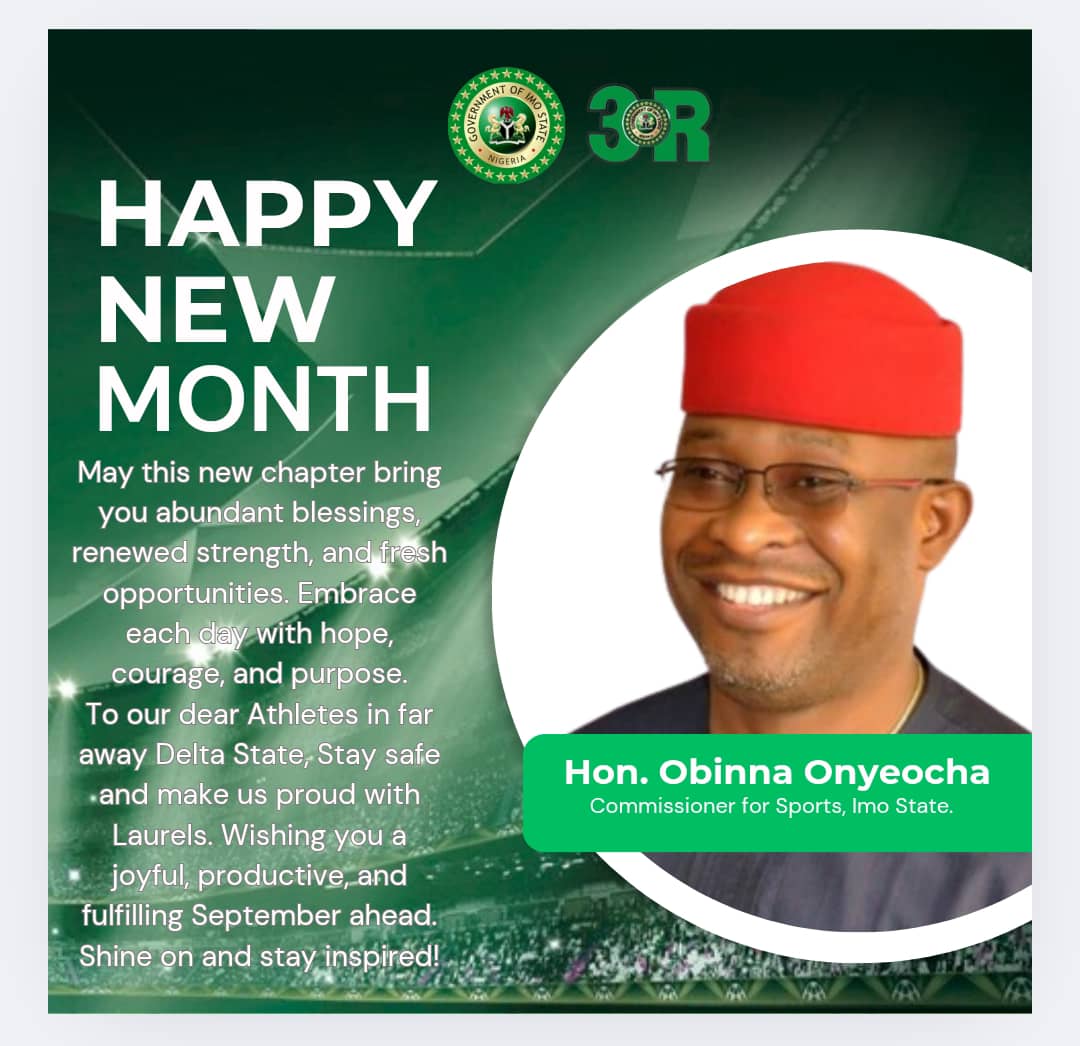 Owerri, September 1, 2025 – The Commissioner for Sports in Imo State, Hon. Obinna Onyeocha, has extended warm new month greetings and a message of encouragement to athletes representing the state in Delta.