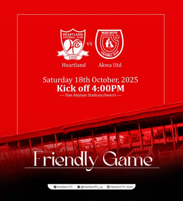 Heartland FC will continue their preparations for the upcoming Nigeria National League (NNL) season with a high-profile friendly against Akwa United at the Dan Anyiam Stadium, Owerri, on Saturday, October 18th, 2025.