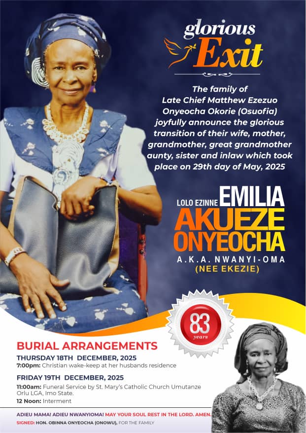 According to the announcement, the late Lolo Emilia Onyeocha will be laid to rest on Friday, December 19, 2025, at the residence of the late Chief Matthew Onyeocha in Umutanze, Orlu Local Government Area of Imo State.