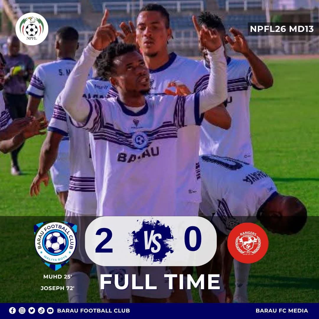 Barau FC moved out of the relegation zone after a 2-0 win over visiting Rangers in a 2025/26 NPFL Match Day 13 encounter at the Sani Abacha Stadium in Kano.