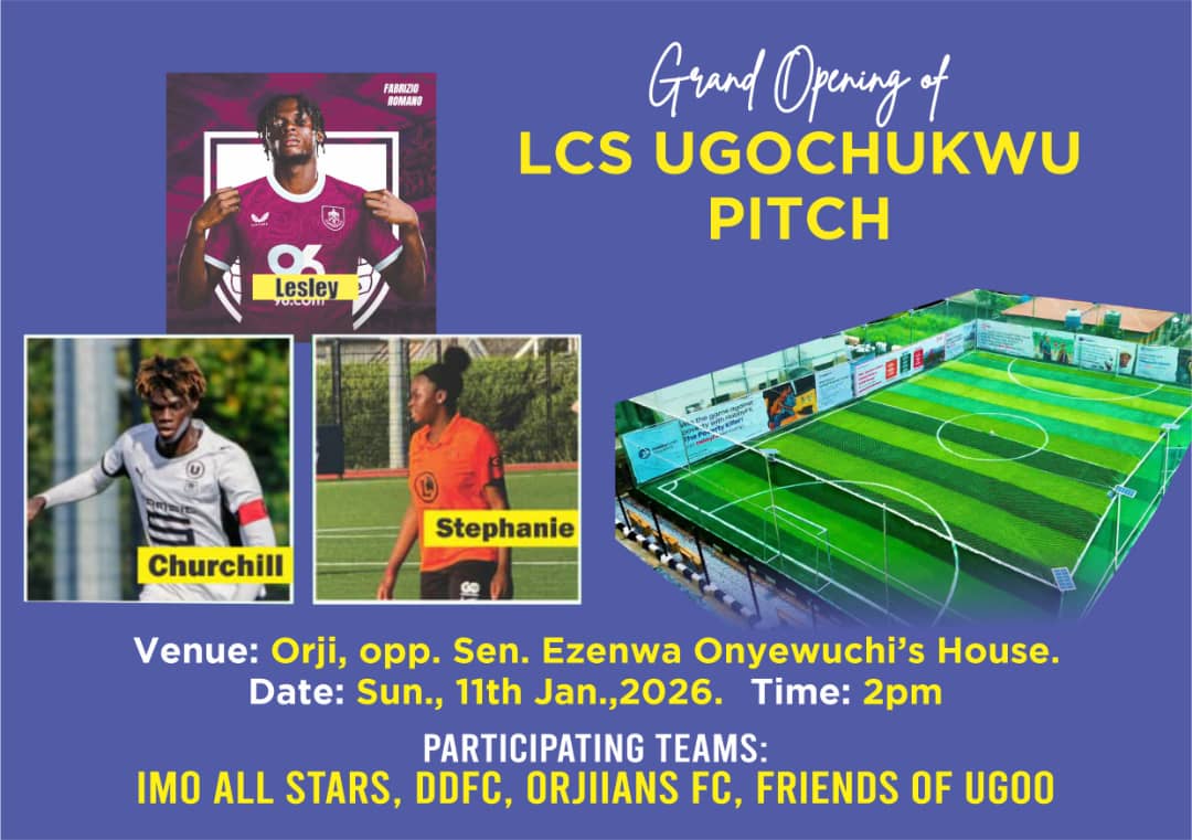 Orji community in Owerri North Local Government Area of Imo State will come alive on Sunday, January 11, 2026, as the LCS Ugochukwu Pitch is officially unveiled in a colourful football fiesta.